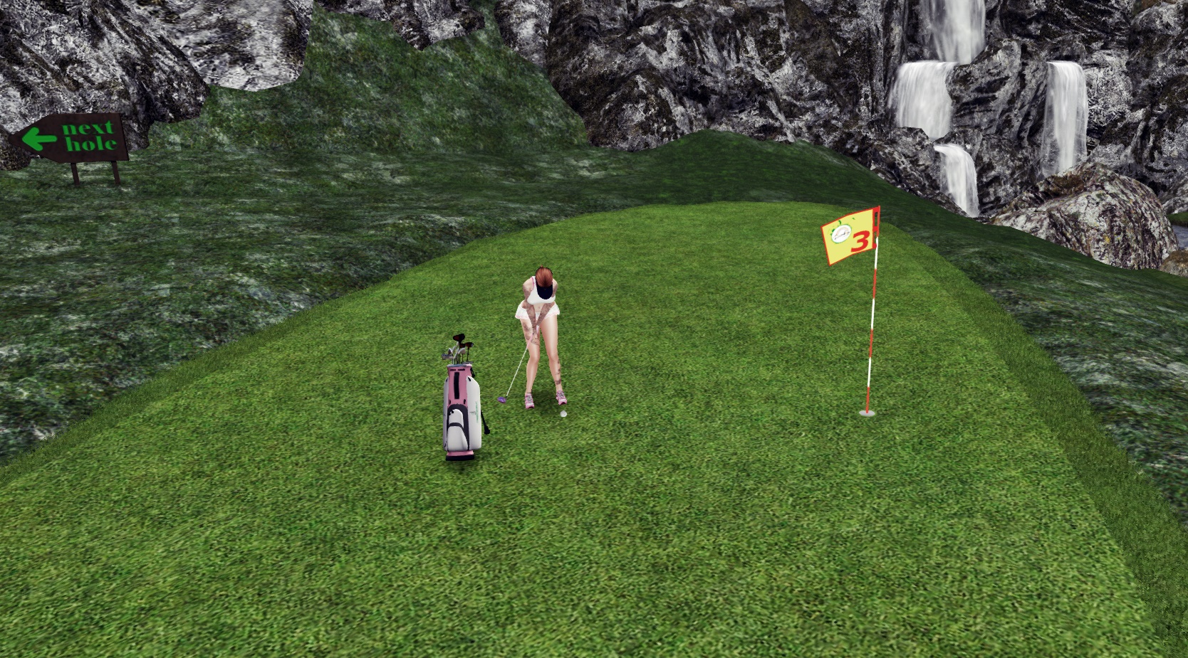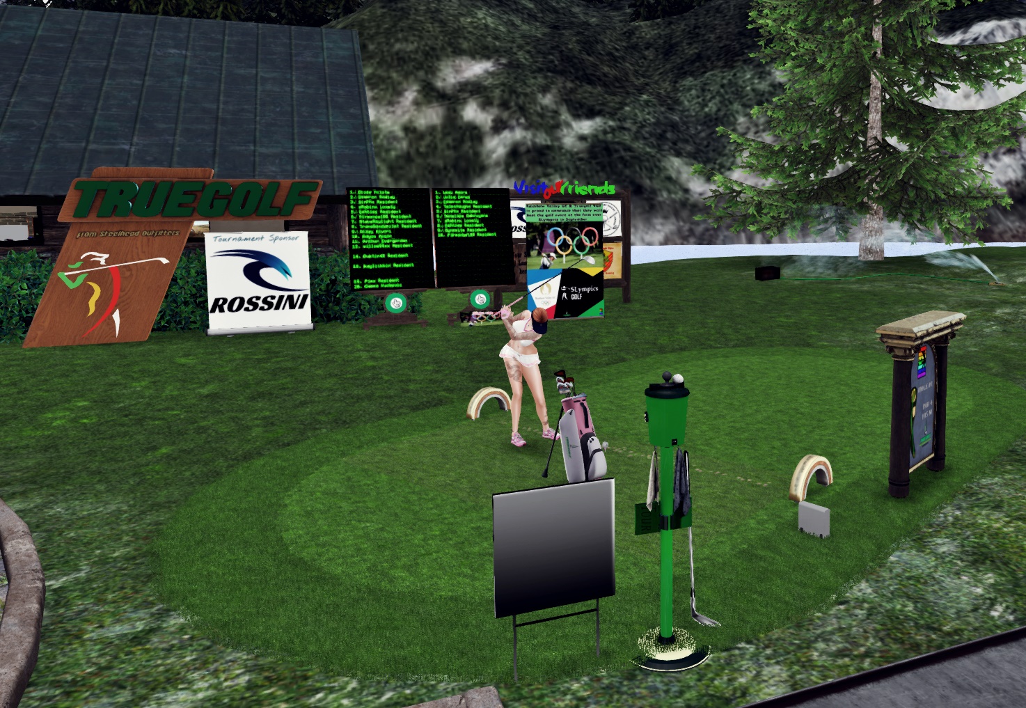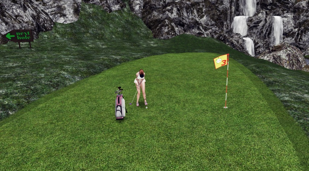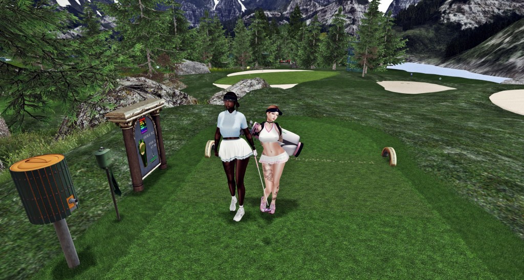 This afternoon, my partner, Sam Daltrey, and I traveled to the gorgeous Rainbow Valley Golf Course. Designed by Lexy Amore (who is an absolute gem and I’ve learned so much playing with her), Rainbow Valley’s 18 holes span two sims. From rezzing at the landing spot, the course is just beautiful. It’s wonderfully laid out with great signage, vibrant colors, a majestic mountain atmosphere, and such a good golfy vibe; it’s impossible not to just smell the grass of this course.