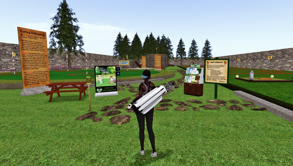I started my exploration by stepping into the clubhouse/pro shop. It has a small bar complete with a bartender who, even though her name was Danni the Slutty Bartender, was completely immune to my charms! 😉 There’s a full TrueGolf pro shop, natch, but what really impressed me was the wealth of instructional material. There are educational notecards available with titles like ‘Understanding Golf in Second Life’, ‘Carry, Roll, & Backspin’, and one that should be required reading, ‘How to Play Strip Golf’.