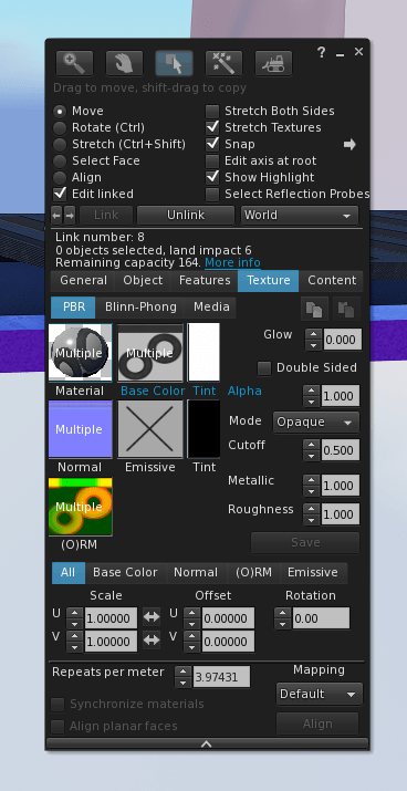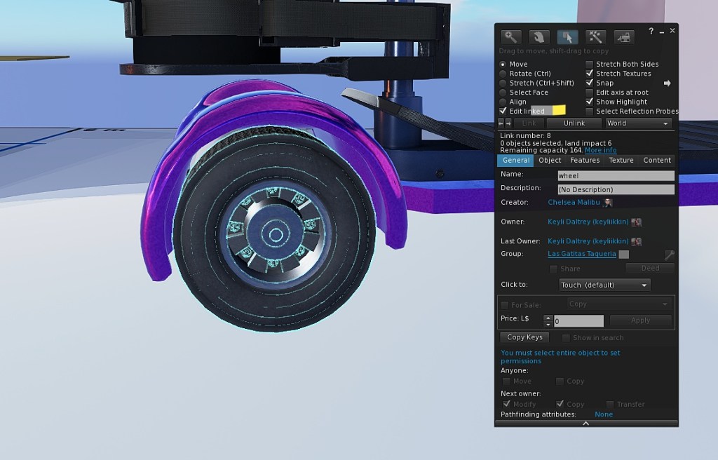 We’re not done. Jamie also mentioned that she would like to have chrome rims with more of a shine, which means we need to find a really shiny PBR chrome texture. I found this one from Surface Studio on the Second Life Marketplace for L$40. That’s the one I’m going to use.