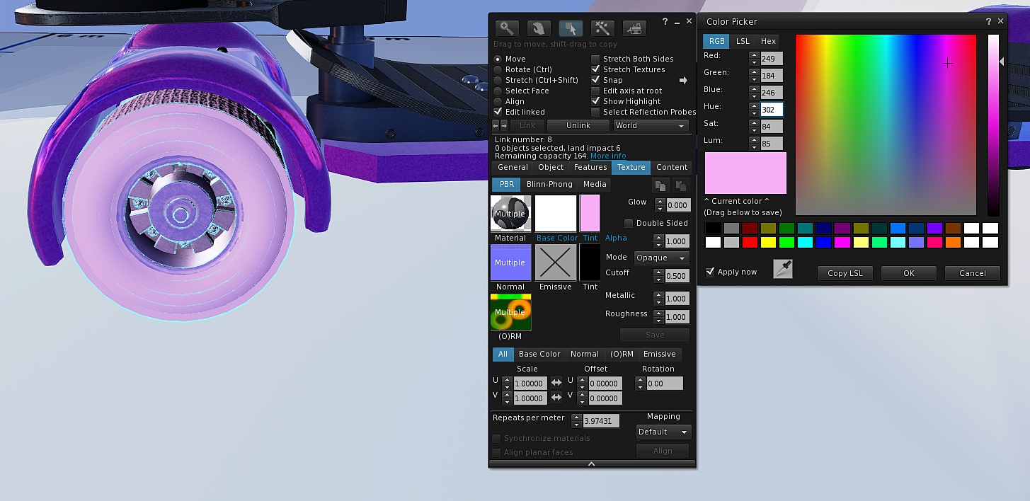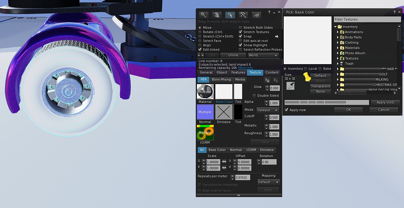 We’re not done. Jamie also mentioned that she would like to have chrome rims with more of a shine, which means we need to find a really shiny PBR chrome texture. I found this one from Surface Studio on the Second Life Marketplace for L$40. That’s the one I’m going to use.