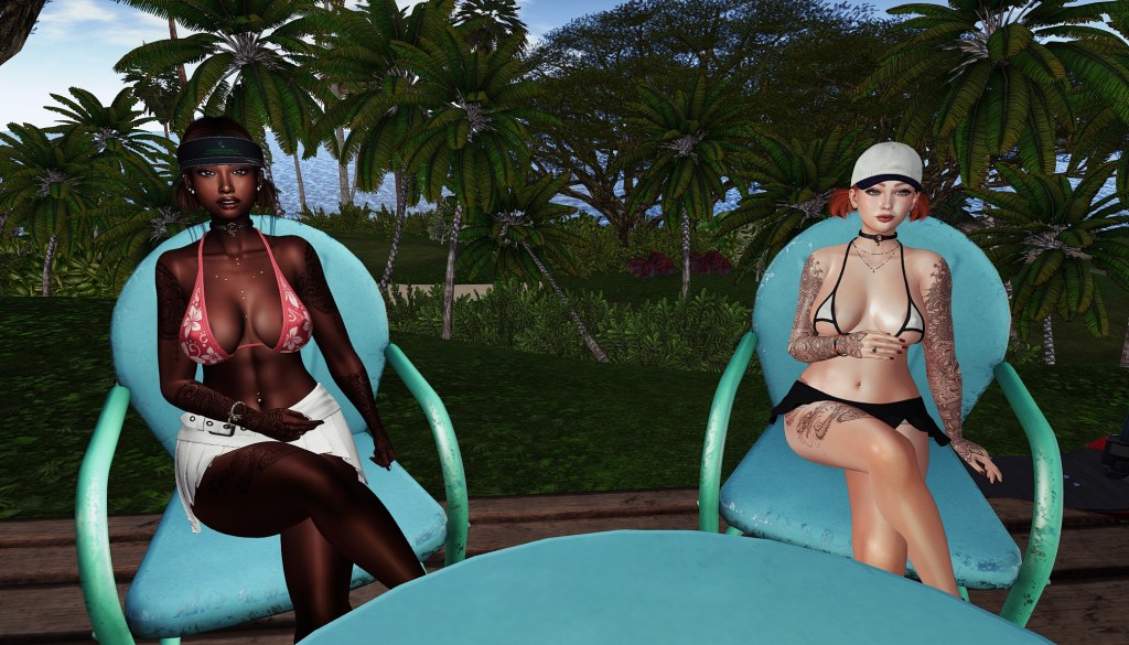 KD: I thought you might – this one is Damiana from DOUX, and it’s one of my favorite dedicated baseball cap hairs in Second Life. DOUX (all caps, because I guess they like to yell their name?) really does make pretty hairs and they’re relatively reasonable. One thing I really like about this one is how many color options it has for the hat. While it didn’t have just the right red for this bikini, it has 24 color options, and you can color the hat and bill separately.