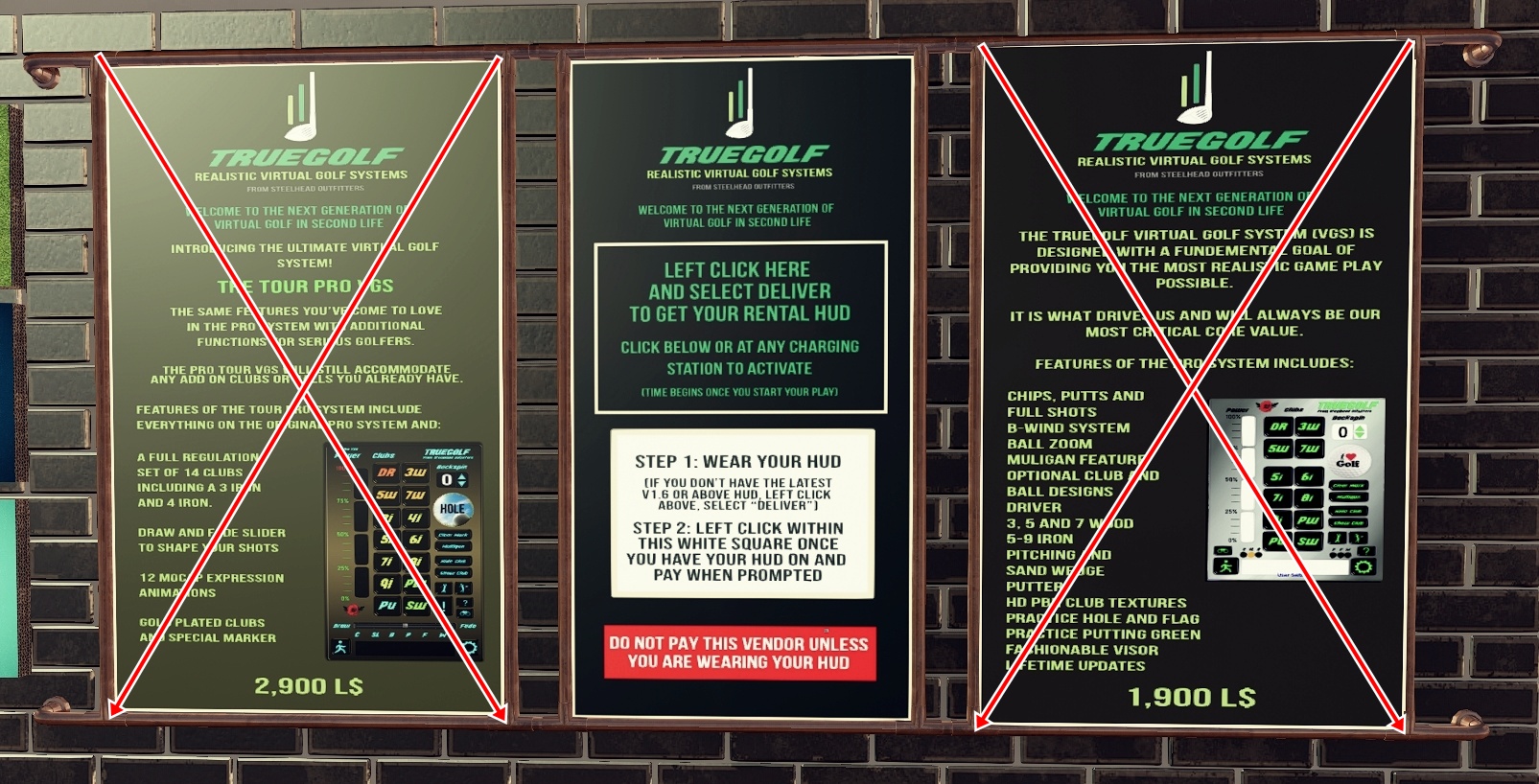 Your next step is to pay your rental fee. Renting a set of TrueGolf clubs costs L$100 for a 24 hour rental. You’re not limited as to how many balls you hit, how many rounds you play, or how many courses you visit, as long as you can fit them in a 24 hour window.